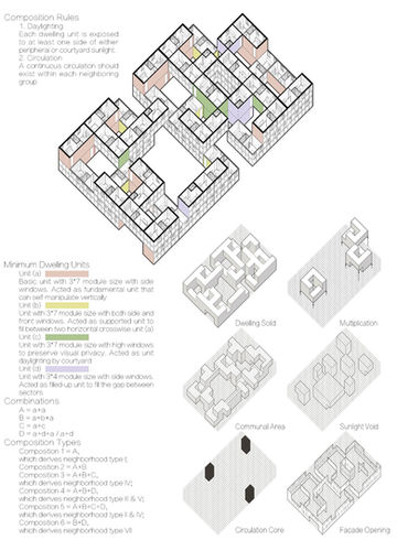This project aims to design a housing complex for the young. The minimum scale for basic dwelling actions as modulus became my starting point of the design, followed by extending the basic modulus to the fundamental dwelling unit and neighboring group. Multi-layered public spaces are designed to meet the different requirements of privacy and encourage residents to go out and meet others as well as a new kind of vertically interlocked neighborhood relationship. The process of the design which was gradually developed from intrinsic architectural knowledge of unit and composition is what I’ve been seeking as a rationalist.